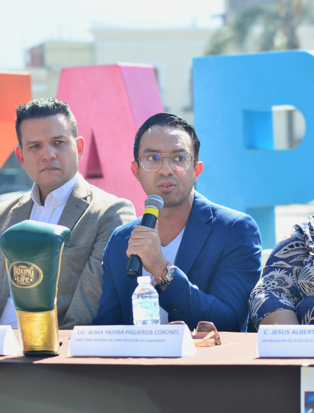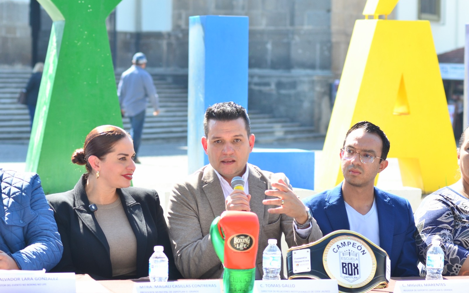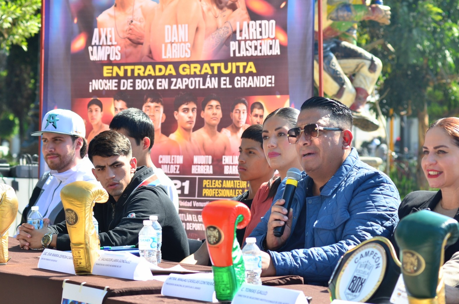Los boxeadores Axel Campos, Daniel Larios y Samuel Plasencia; Jesús Alberto Pascual Rivera, entrenador de la Escuela Municipal de Box; Alma Yadira Figueroa Coronel, directora general de Construcción de Comunidad; Eva María Zepeda Carillo, jefa de Fomento Deportivo; Salvador Lara González, representante de Clase y Talento; Tomás Gallo, en representación de Fernando Ortega, director del CODE Jalisco; Miguel Marentes, regidor del Ayuntamiento; y Magali Casillas Contreras, presidenta de Zapotlán el Grande encabezaron esta reunión con los medios de comunicación.