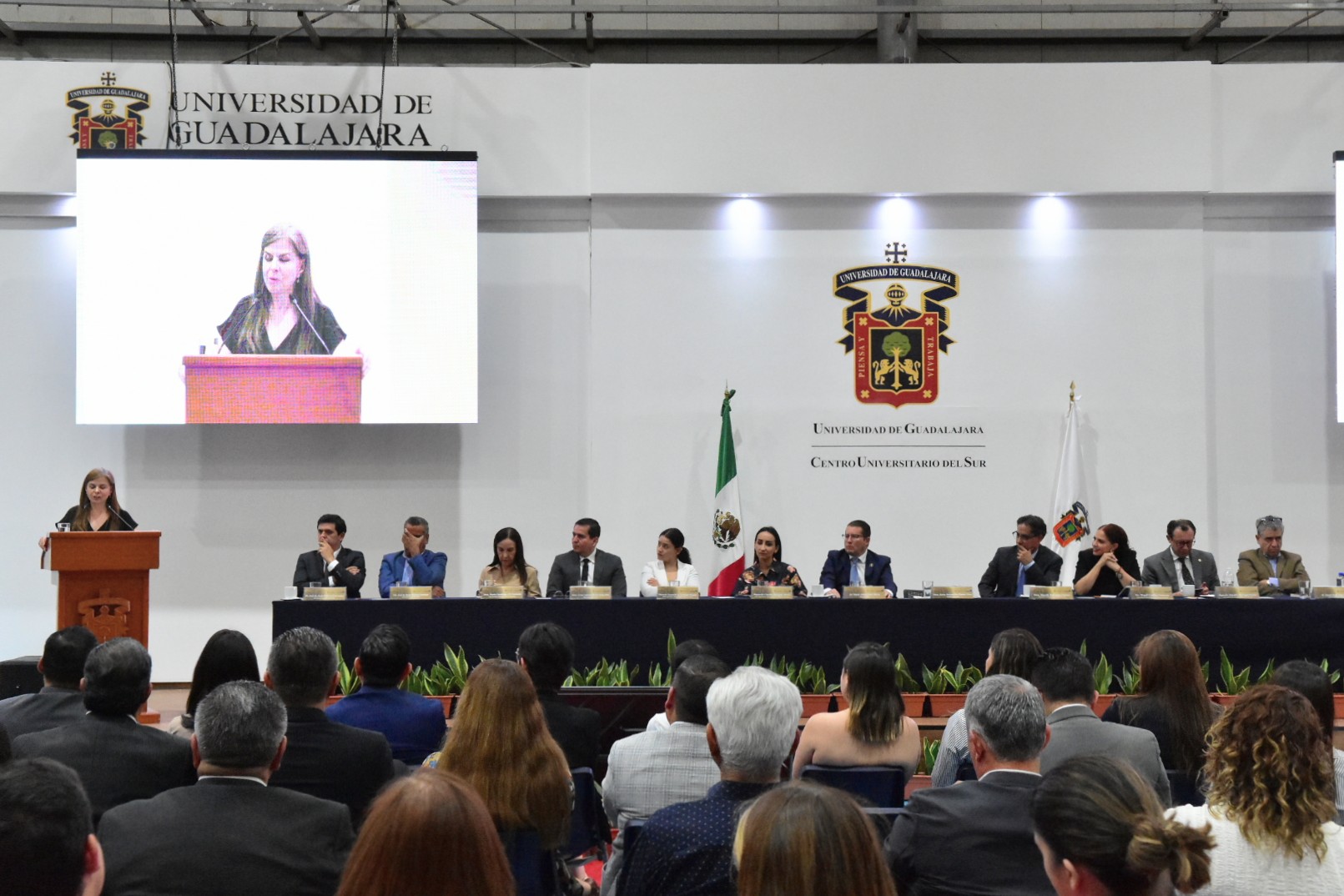 En su intervención, la rectora general de la Universidad de Guadalajara felicitó al rector del Centro Universitario del Sur por su primer año de su gestión, la cual destaca por mostrar un liderazgo que convence y no un liderazgo que se impone.