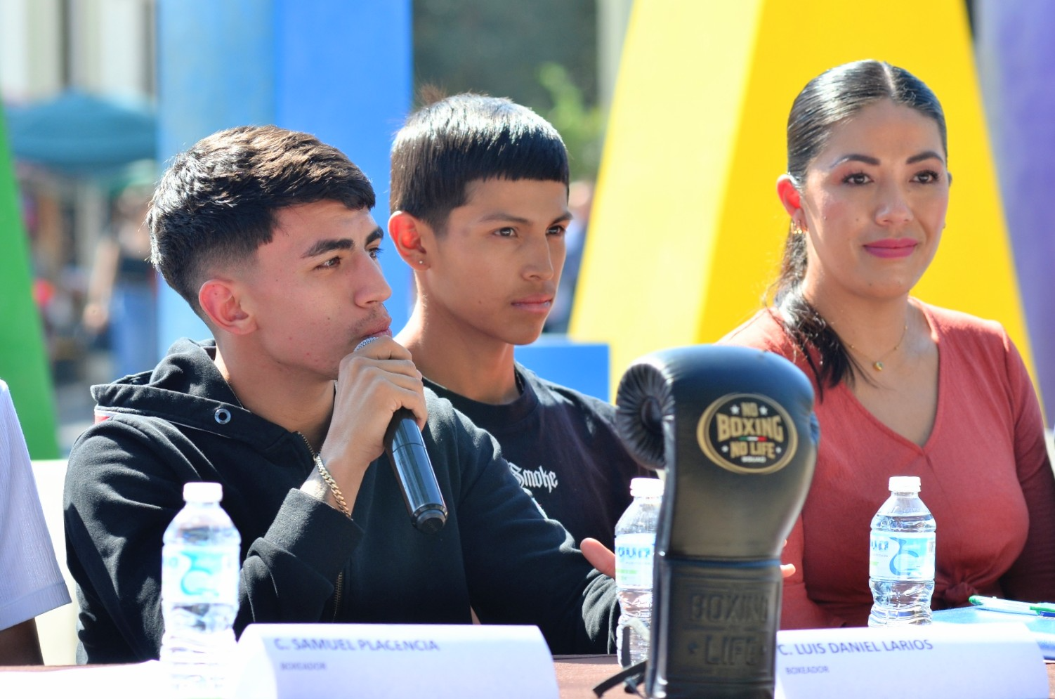 Los boxeadores Axel Campos, Daniel Larios y Samuel Plasencia; Jesús Alberto Pascual Rivera, entrenador de la Escuela Municipal de Box; Alma Yadira Figueroa Coronel, directora general de Construcción de Comunidad; Eva María Zepeda Carillo, jefa de Fomento Deportivo; Salvador Lara González, representante de Clase y Talento; Tomás Gallo, en representación de Fernando Ortega, director del CODE Jalisco; Miguel Marentes, regidor del Ayuntamiento; y Magali Casillas Contreras, presidenta de Zapotlán el Grande encabezaron esta reunión con los medios de comunicación.