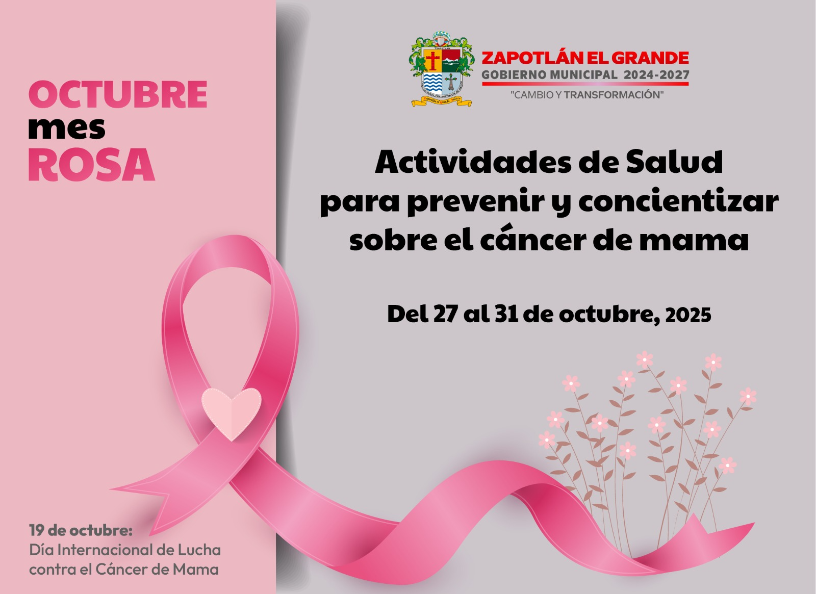 CIUDAD GUZMÁN, JALISCO. 20 DE OCTUBRE DE 2025 (CS) El Gobierno Municipal que encabeza la alcaldesa Magali Casillas Contreras, invita a la población en general a participar en las actividades que se tendrán del 27 al 31 de octubre en Zapotlán el Grande, a fin de crear conciencia y sensibilización sobre el Cáncer de Mama, tipo de cáncer más común y una de las principales causas de mortandad en mujeres de todo el mundo.
